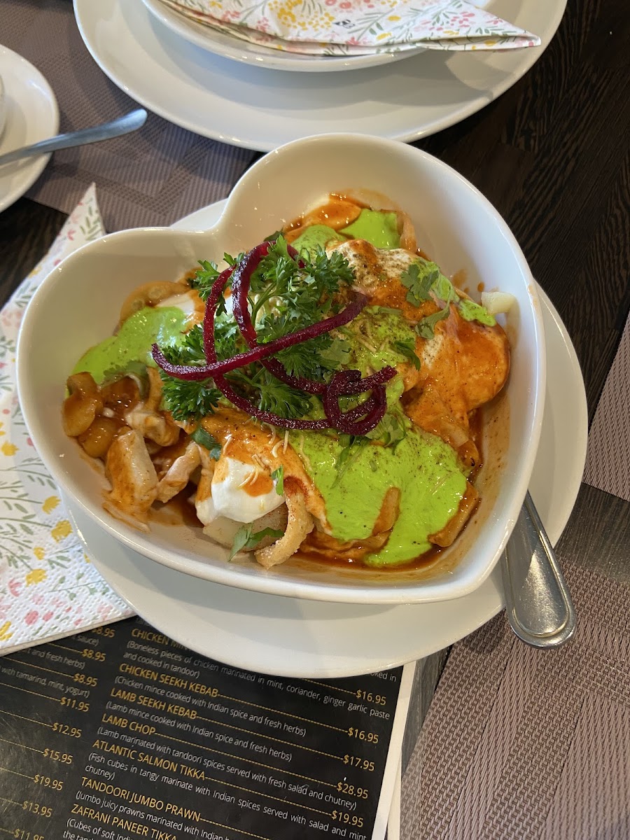 Papri, mashed potatoes and chickpeas served with, tamarind chutney, mint chutney and yogurt.